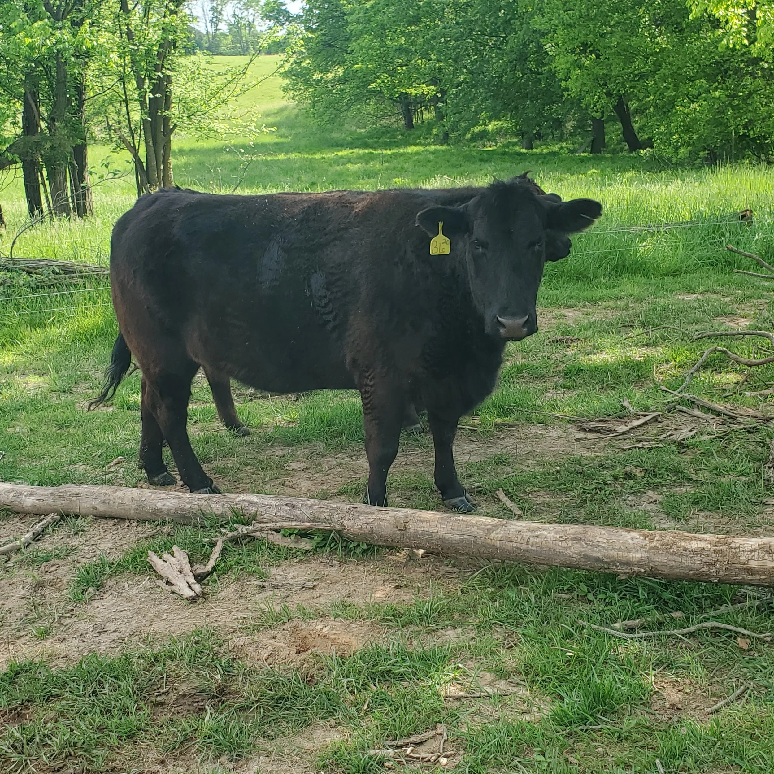 Moonstar is one of our first lowline Angus crosses to be bought. She is a proven mama and had her calf, Ghostina with us in 2024. As a mama she leaves a little to be desired as she will gladly leave her calf for food. She is probably our most vocal cow and is due to calve this fall.