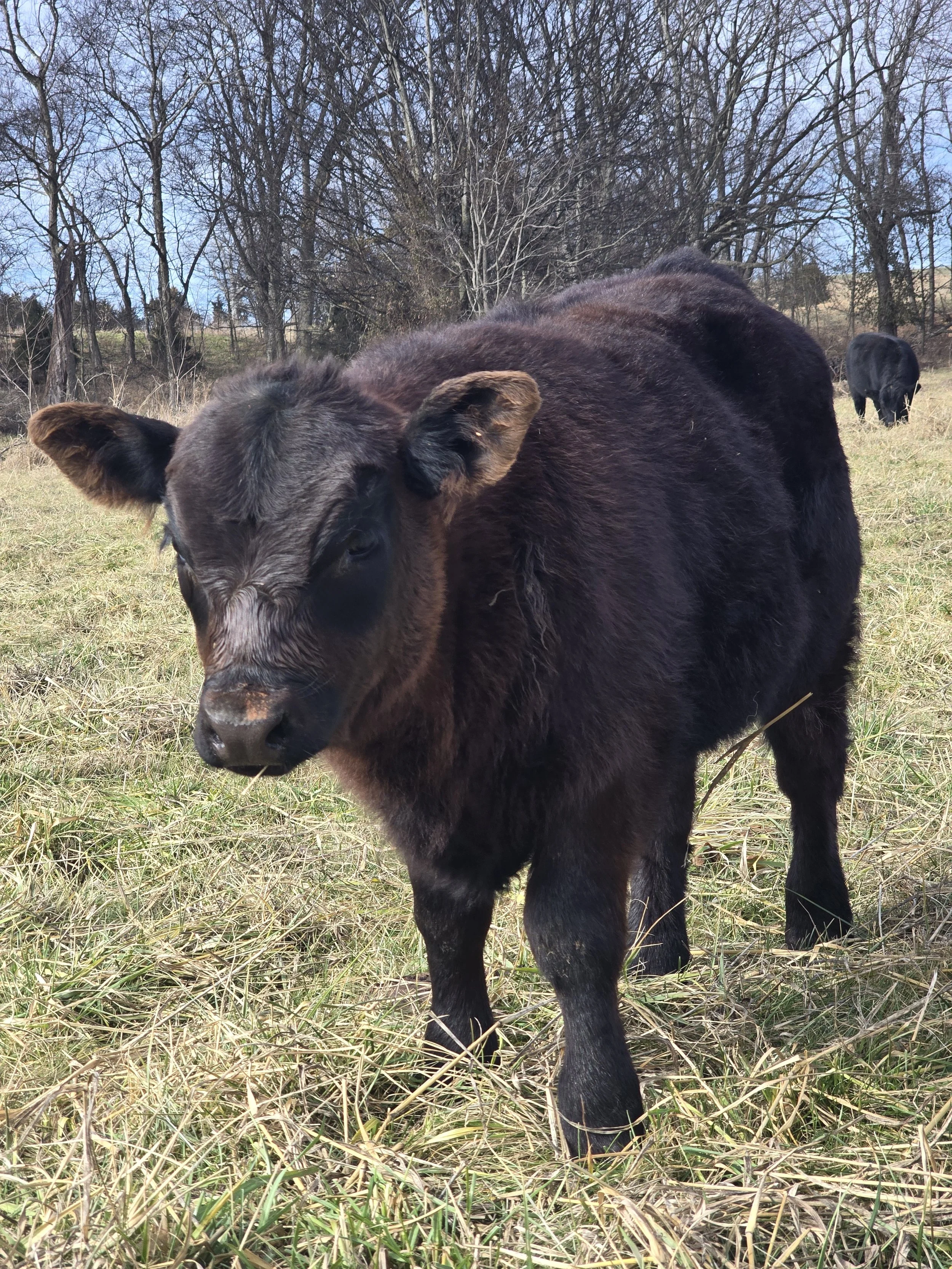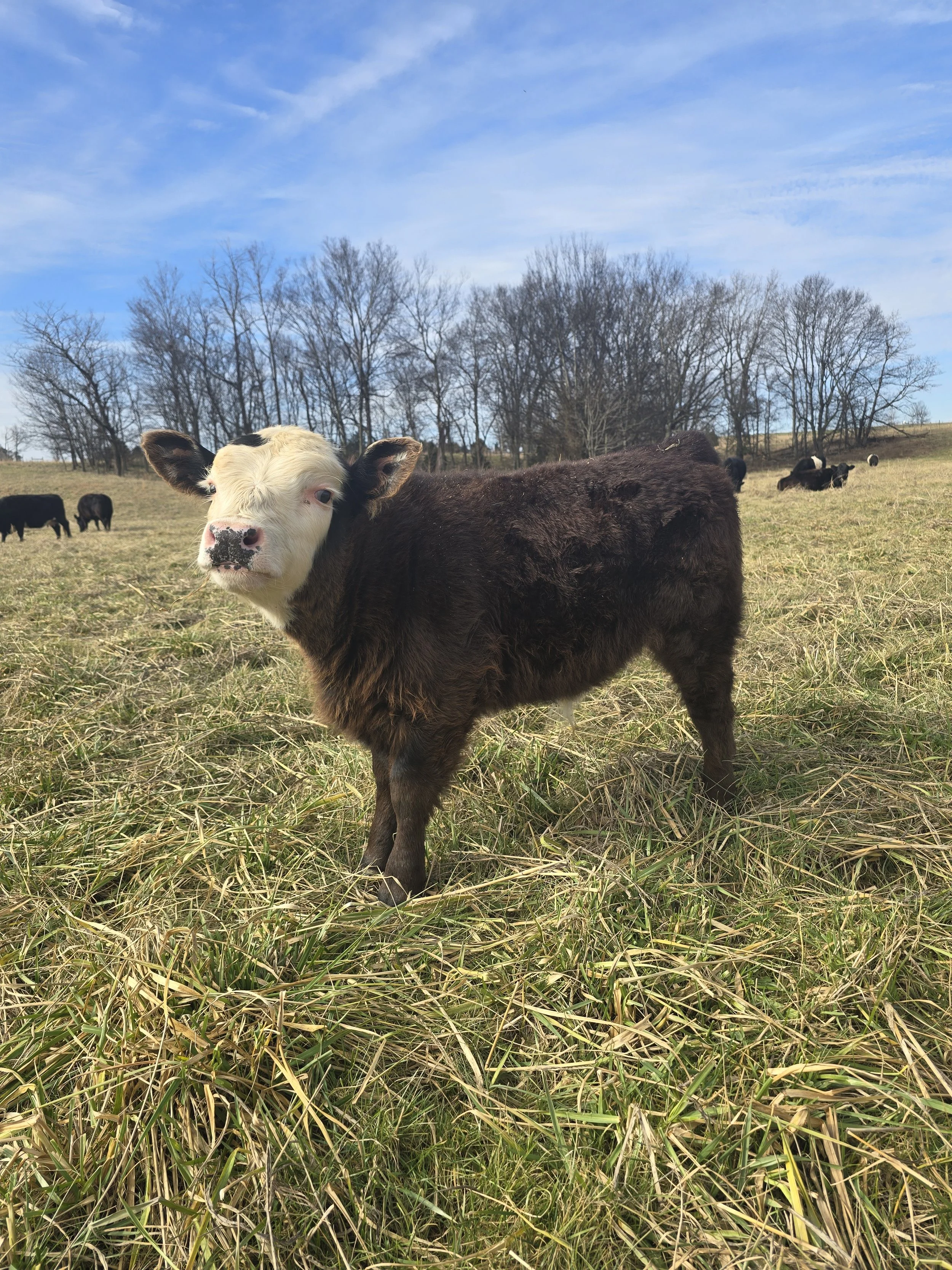 This little guy takes after his momma, Moonstar. He was born in October of 2025. He is best friends with our other calf, Trouble.